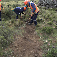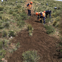 Personal de piso realizando el tendido de material acopiado con fines de recuperar la pendiente original de la zona, nótese que la zona cortada y plataforma han sido rellenadas.